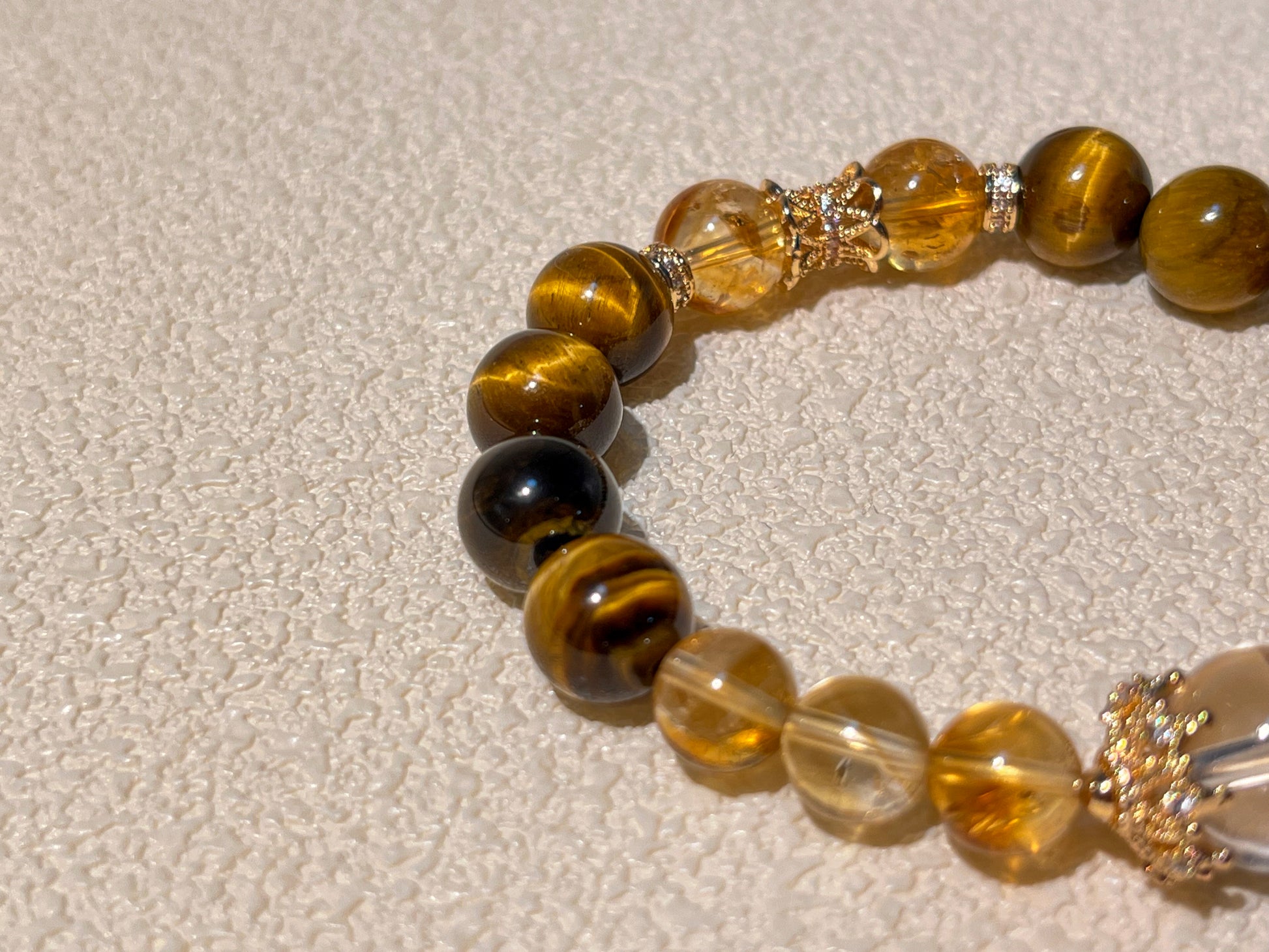 This stunning handcrafted bracelet combines the powerful trio of Golden Tiger's Eye, Citrine, and Clear Quartz, creating an exceptional synergy for attracting abundance, boosting confidence, and manifesting success.